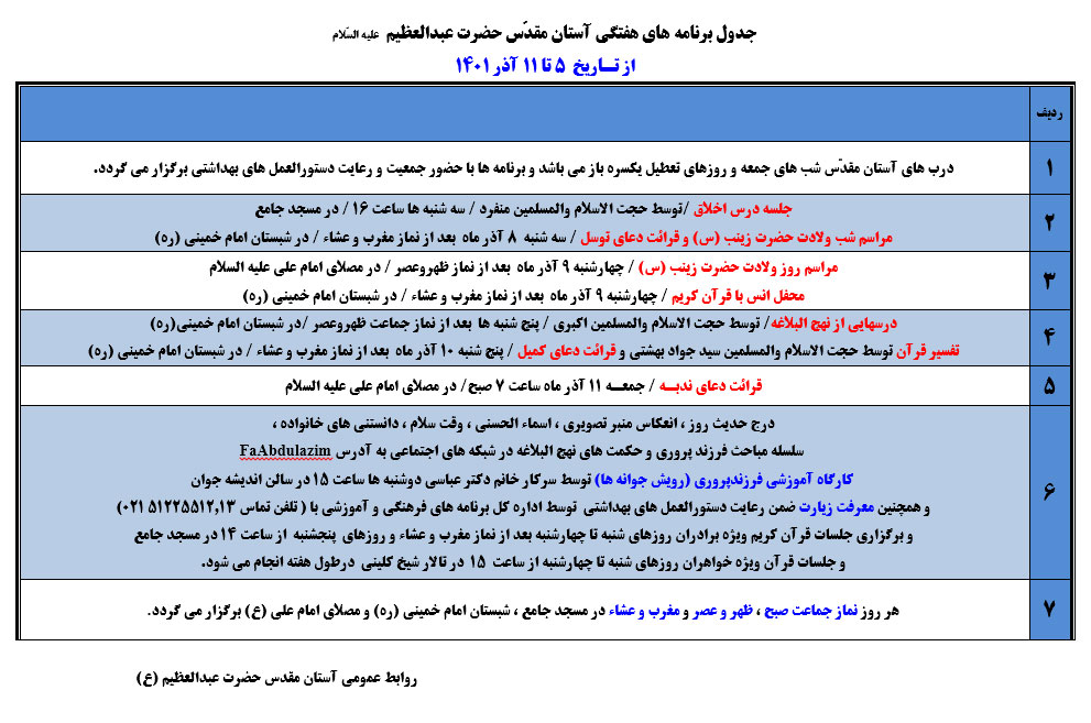 اعلام برنامه های هفتگی آستان مقدّس از 5 تا 11 آذر ماه