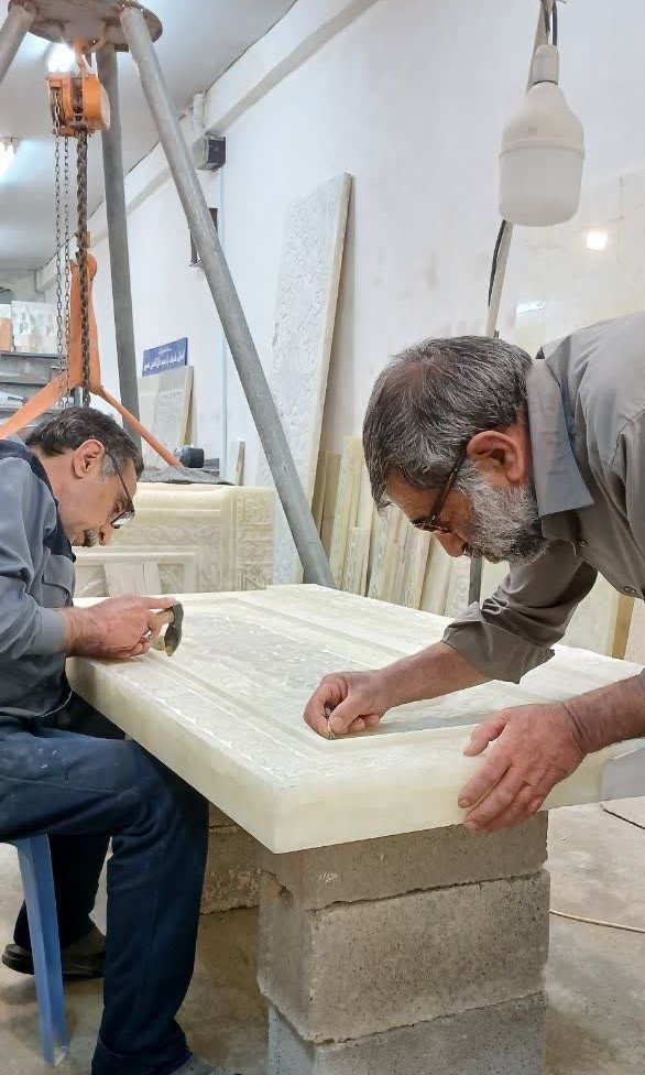 عملیات حجاری سنگ مزار، توسط جمعی از هنرمندان برجسته شیراز و به سرپرستی استاد محمدجواد شبیه، در حال اجراست. این گروه هنرمند با بهرهگیری از مهارتهای سنتی و نوآورانه، نقوش و کتیبههای معنوی و هنری را بر سنگ مرقد شریف حکاکی کردهاند.